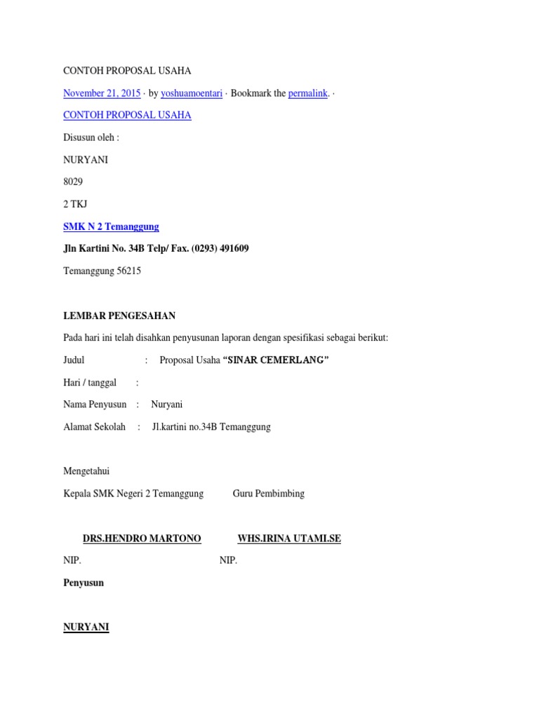 Melalui contoh proposal usaha, pelaku bisnis dapat mempersiapkan modal hingga melihat peluang pasar yang dapat diterapkan pada. Untuk kamu yang sedang merintis usaha kerjinan dan sedang membutuhkan dana, berikut proposal bisnis yang bisa kamu ajukan kepada investor. Proposal ini disusun dalam rangka memenuhi tugas kewirausahaan untuk ujian praktik kewirausahaan keberhasilan dalam penyusun an proposal ini tidak lepas dari bantuan. Sebelum memulai sebuah bisnis atau usaha harus dilakukan perencanaan agar bisnis yang kita lakukan bisa berjalan dengan lancar sesuai dengan target yang ingin dicapai. Proposal usaha atau bisnis memiliki susunan yang tidak sama dengan proposal kegiatan.